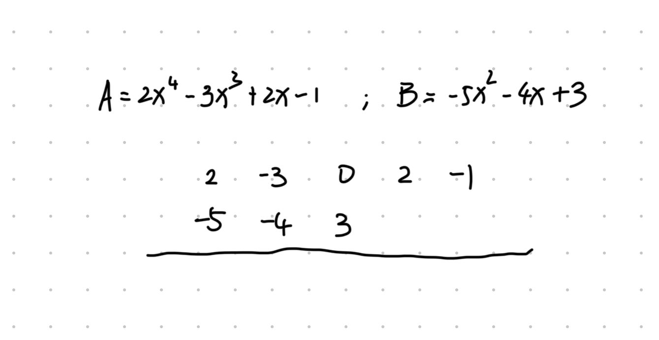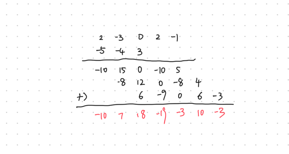 - 竖式相乘,第二行每个系数乘以第一行每个系数,乘积结果对应排列: