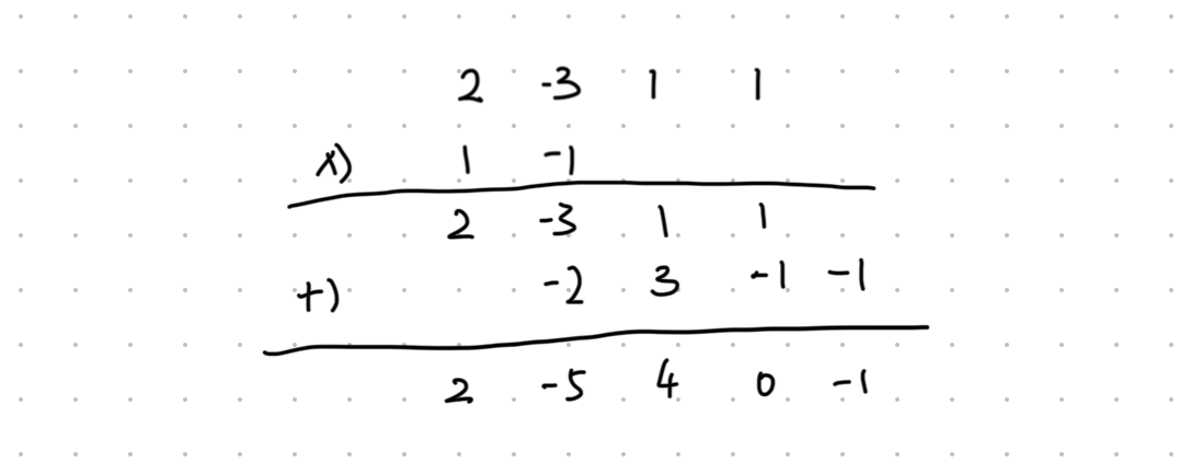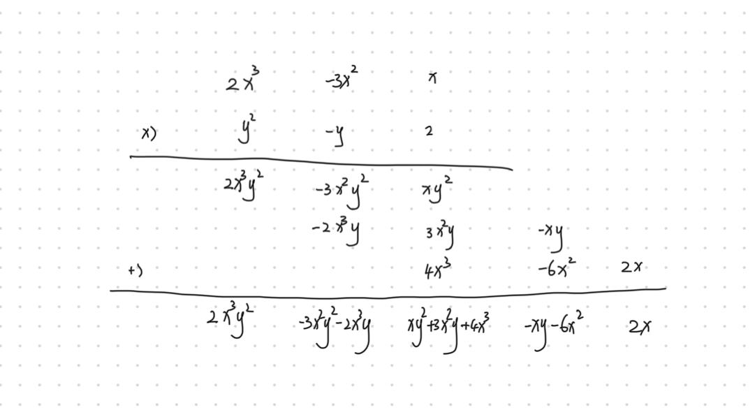 - 竖式相乘,第二行每个系数乘以第一行每个系数,乘积结果对应排列: