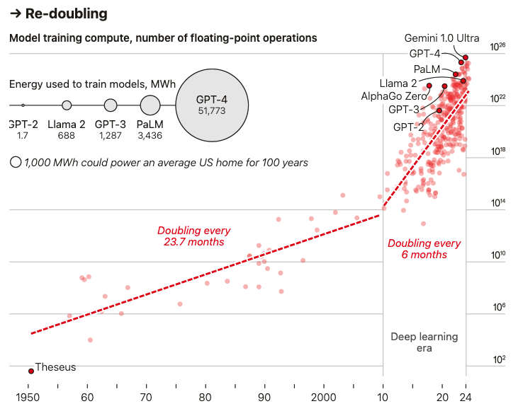次浮点运算(flop),是十年前用于 AlexNet 的4000万倍,花费约1亿美元。据报道,谷歌在 2024 年发布的其最强模型 Gemini-Ultra 的成本是其两倍;Epoch AI 估计其可能需要进行 次浮点运算。这些总量大得难以想象,堪比可观测宇宙中所有星系的星星数量,或太平洋中的水滴数量。