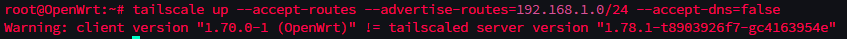 tailscale up --accept-routes --advertise-routes=192.168.1.0/24 --accept-dns=false