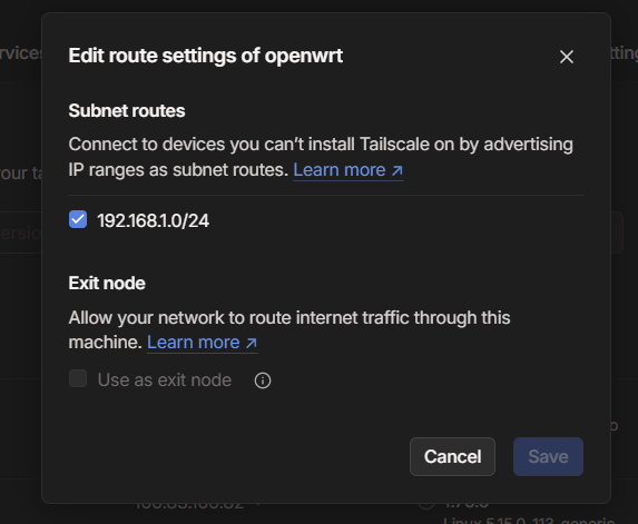 在 Tailscale 控制台设置路由设置,勾选并保存