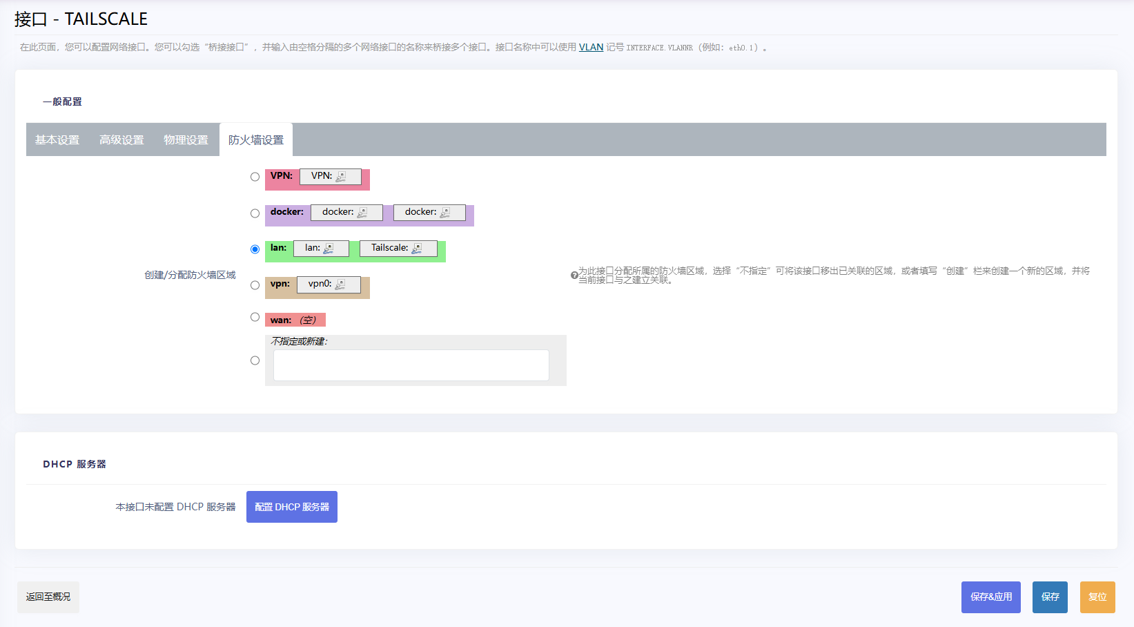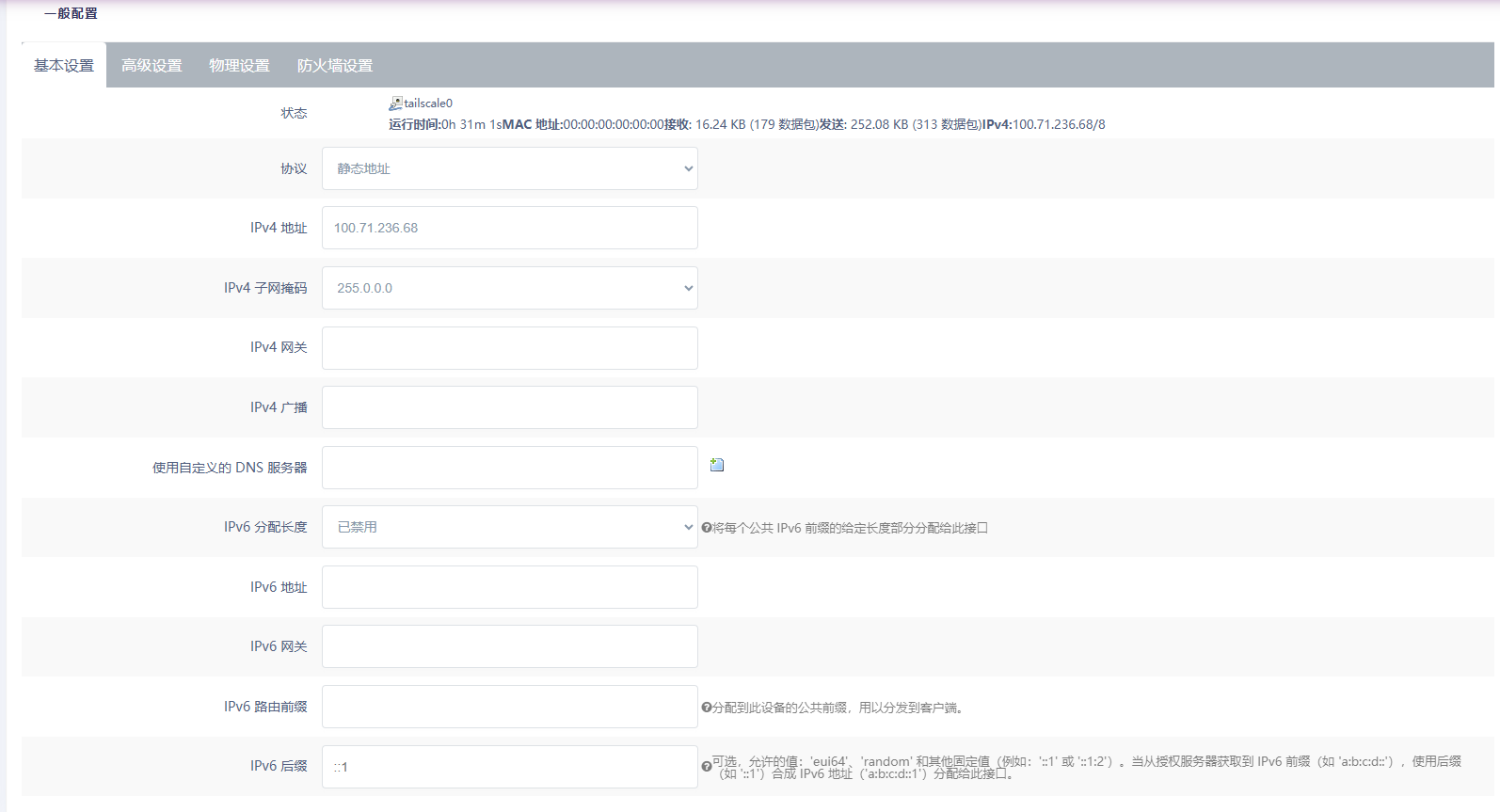 tailscale0 - IPv4 地址:填写 Tailscale 分配给路由器的 IP(如